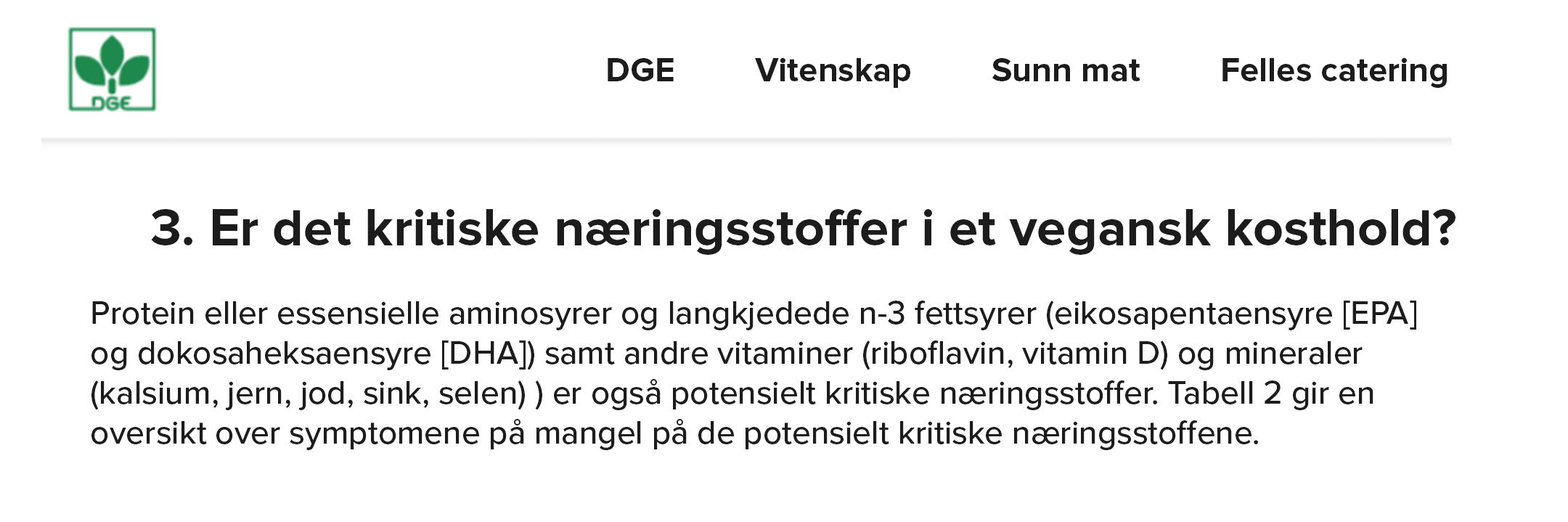 Ifølge Ernæringsavdelingen regnes også aminosyrer som kritiske næringsstoffer i et vegansk kosthold.