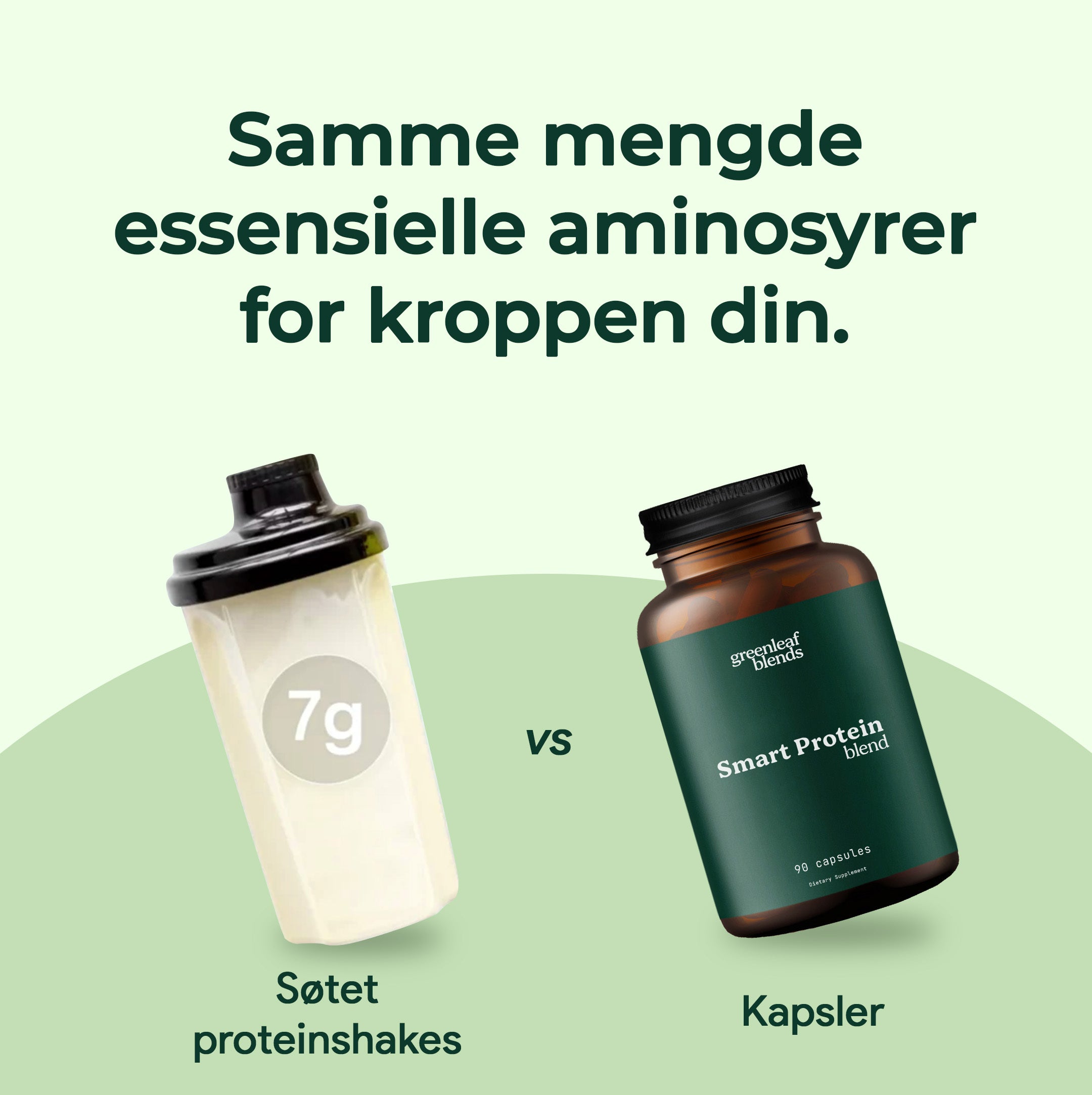1 tablett Smart Protein tilsvarer samme mengde essensielle aminosyrer som kan brukes til cellebygging som 7 g proteinshake. Dette betyr at 1 g Smart Protein (1 tablett) har samme effekt som 7 g protein fra proteinshaker.