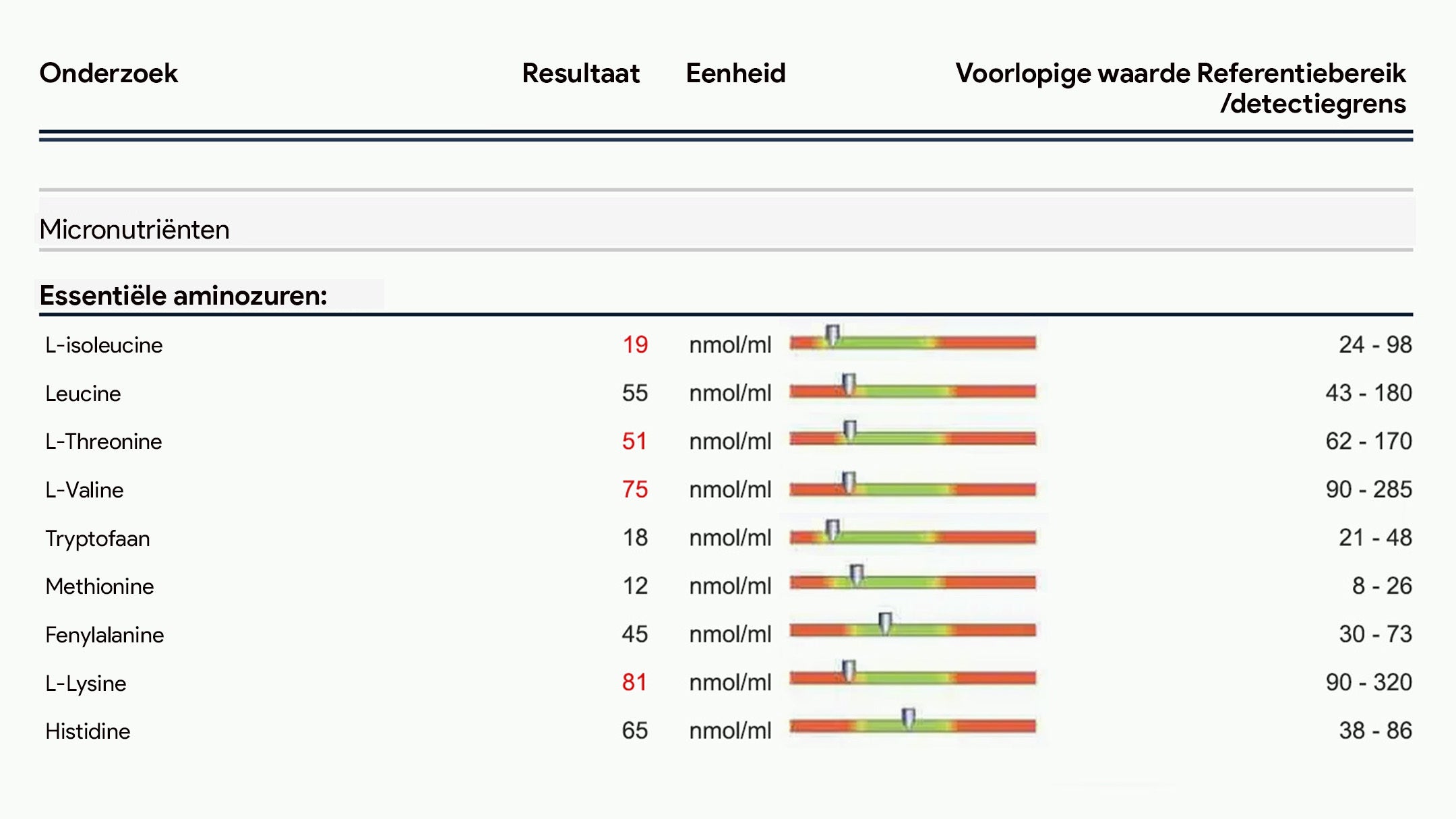 Slechts enkele aminozuren bevonden zich in het groene bereik - ook al had ik sinds twee maanden weer eieren en vis in mijn dieet geïntroduceerd – onregelmatig, maar toch.